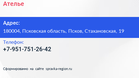 Ателье по адресу 180004, Псковская область, Псков, Стахановская, 19 в дальнейшем Организация, размещена в следующих категориях: