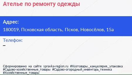 Ателье по ремонту одежды по адресу 180019, Псковская область, Псков, Новосёлов, 15а в дальнейшем Организация, размещена в следующих категориях: