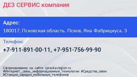 ДЕЗ-СЕРВИС, компания по адресу 180017, Псковская область, Псков, Яна Фабрициуса, 3 в дальнейшем Организация, размещена в следующих категориях: