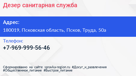 Дезер, санитарная служба по адресу 180019, Псковская область, Псков, Труда, 50а в дальнейшем Организация, размещена в следующих категориях: