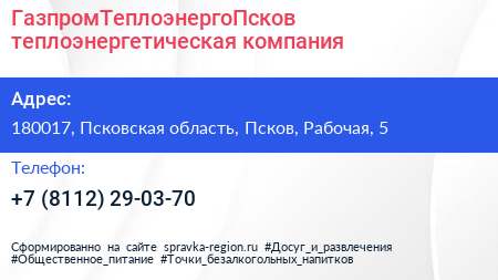 ГазпромТеплоэнергоПсков, теплоэнергетическая компания по адресу 180017, Псковская область, Псков, Рабочая, 5 в дальнейшем Организация, размещена в следующих категориях: