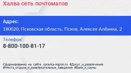 Халва, сеть почтоматов по адресу 180020, Псковская область, Псков, Алексея Алёхина, 2 в дальнейшем Организация, размещена в следующих категориях: