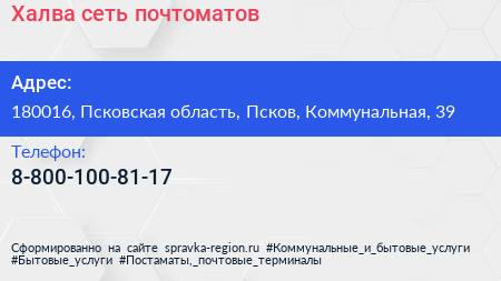 Халва, сеть почтоматов по адресу 180016, Псковская область, Псков, Коммунальная, 39 в дальнейшем Организация, размещена в следующих категориях: