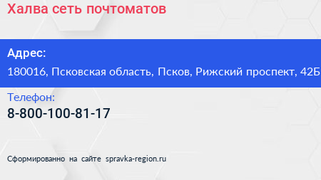 Халва, сеть почтоматов по адресу 180016, Псковская область, Псков, Рижский проспект, 42Б в дальнейшем Организация, размещена в следующих категориях: