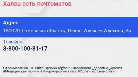 Халва, сеть почтоматов по адресу 180020, Псковская область, Псков, Алексея Алёхина, 4а в дальнейшем Организация, размещена в следующих категориях: