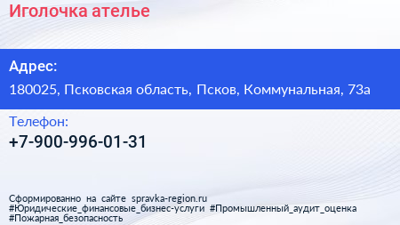 Иголочка, ателье по адресу 180025, Псковская область, Псков, Коммунальная, 73а в дальнейшем Организация, размещена в следующих категориях: