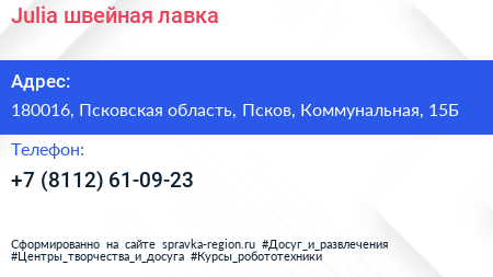Julia, швейная лавка по адресу 180016, Псковская область, Псков, Коммунальная, 15Б в дальнейшем Организация, размещена в следующих категориях: