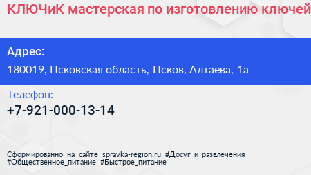 КЛЮЧиК, мастерская по изготовлению ключей по адресу 180019, Псковская область, Псков, Алтаева, 1а в дальнейшем Организация, размещена в следующих категориях: