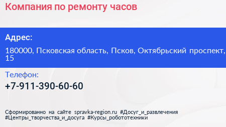 Компания по ремонту часов по адресу 180000, Псковская область, Псков, Октябрьский проспект, 15 в дальнейшем Организация, размещена в следующих категориях: