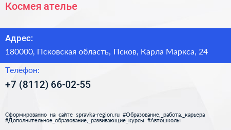 Космея, ателье по адресу 180000, Псковская область, Псков, Карла Маркса, 24 в дальнейшем Организация, размещена в следующих категориях: