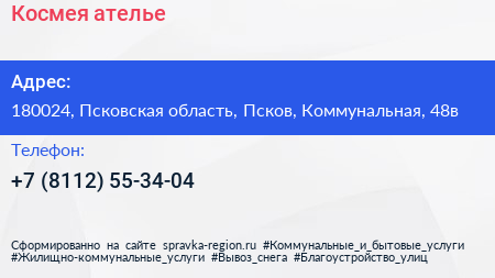 Космея, ателье по адресу 180024, Псковская область, Псков, Коммунальная, 48в в дальнейшем Организация, размещена в следующих категориях: