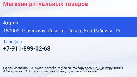 Магазин ритуальных товаров по адресу 180002, Псковская область, Псков, Яна Райниса, 75 в дальнейшем Организация, размещена в следующих категориях: