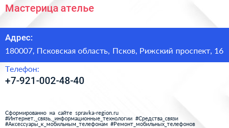 Мастерица, ателье по адресу 180007, Псковская область, Псков, Рижский проспект, 16 в дальнейшем Организация, размещена в следующих категориях: