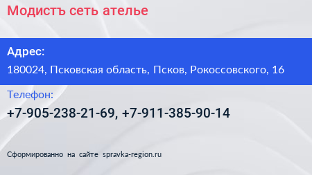 Модистъ, сеть ателье по адресу 180024, Псковская область, Псков, Рокоссовского, 16 в дальнейшем Организация, размещена в следующих категориях: