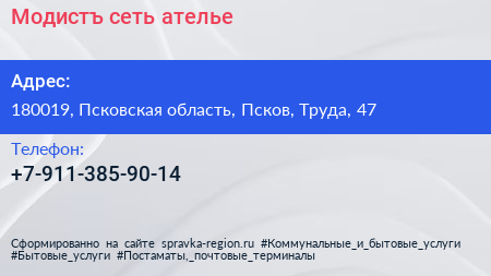 Модистъ, сеть ателье по адресу 180019, Псковская область, Псков, Труда, 47 в дальнейшем Организация, размещена в следующих категориях: