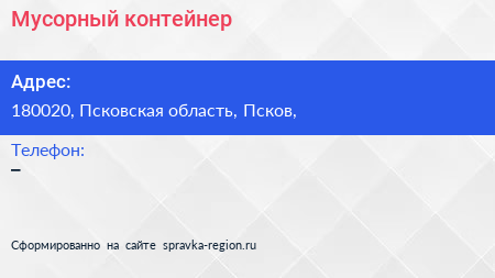 Мусорный контейнер по адресу 180020, Псковская область, Псков, в дальнейшем Организация, размещена в следующих категориях: