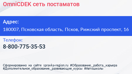 OmniCDEK, сеть постаматов по адресу 180007, Псковская область, Псков, Рижский проспект, 16 в дальнейшем Организация, размещена в следующих категориях: