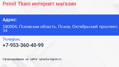 Peinit Tkani, интернет-магазин по адресу 180004, Псковская область, Псков, Октябрьский проспект, 54 в дальнейшем Организация, размещена в следующих категориях: