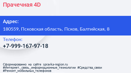 Прачечная 4D по адресу 180559, Псковская область, Псков, Балтийская, 8 в дальнейшем Организация, размещена в следующих категориях: