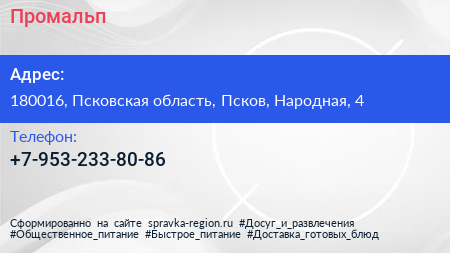 Промальп по адресу 180016, Псковская область, Псков, Народная, 4 в дальнейшем Организация, размещена в следующих категориях: