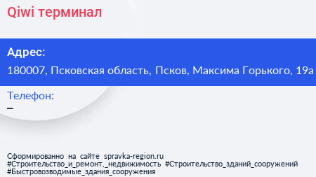 Qiwi, терминал по адресу 180007, Псковская область, Псков, Максима Горького, 19а в дальнейшем Организация, размещена в следующих категориях: