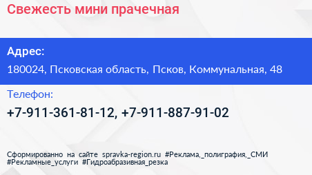 Свежесть, мини-прачечная по адресу 180024, Псковская область, Псков, Коммунальная, 48 в дальнейшем Организация, размещена в следующих категориях: