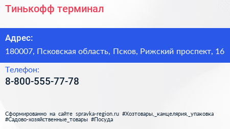 Тинькофф, терминал по адресу 180007, Псковская область, Псков, Рижский проспект, 16 в дальнейшем Организация, размещена в следующих категориях: