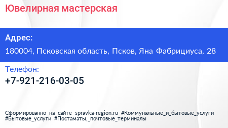 Ювелирная мастерская по адресу 180004, Псковская область, Псков, Яна Фабрициуса, 28 в дальнейшем Организация, размещена в следующих категориях: