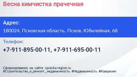 Весна, химчистка-прачечная по адресу 180024, Псковская область, Псков, Юбилейная, 68 в дальнейшем Организация, размещена в следующих категориях: