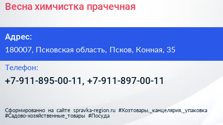 Весна, химчистка-прачечная по адресу 180007, Псковская область, Псков, Конная, 35 в дальнейшем Организация, размещена в следующих категориях: