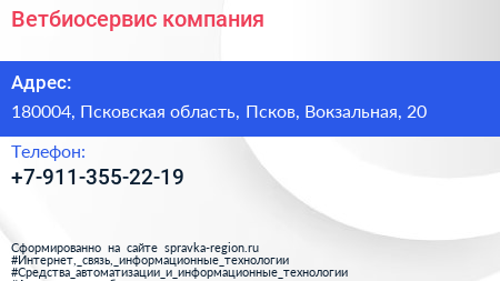 Ветбиосервис, компания по адресу 180004, Псковская область, Псков, Вокзальная, 20 в дальнейшем Организация, размещена в следующих категориях:
