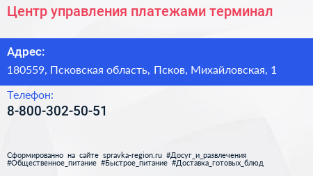 Центр управления платежами, терминал по адресу 180559, Псковская область, Псков, Михайловская, 1 в дальнейшем Организация, размещена в следующих категориях:
