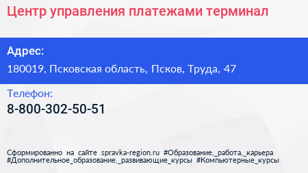 Центр управления платежами, терминал по адресу 180019, Псковская область, Псков, Труда, 47 в дальнейшем Организация, размещена в следующих категориях: