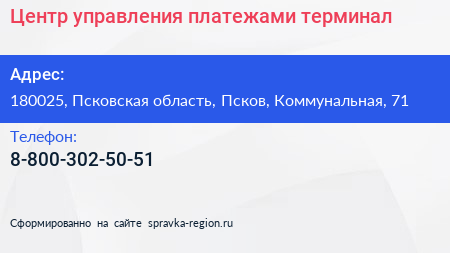 Центр управления платежами, терминал по адресу 180025, Псковская область, Псков, Коммунальная, 71 в дальнейшем Организация, размещена в следующих категориях: