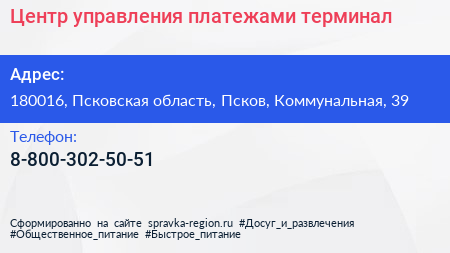 Центр управления платежами, терминал по адресу 180016, Псковская область, Псков, Коммунальная, 39 в дальнейшем Организация, размещена в следующих категориях:
