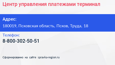 Центр управления платежами, терминал по адресу 180019, Псковская область, Псков, Труда, 18 в дальнейшем Организация, размещена в следующих категориях: