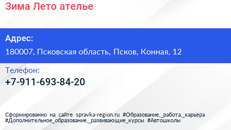 Зима Лето, ателье по адресу 180007, Псковская область, Псков, Конная, 12 в дальнейшем Организация, размещена в следующих категориях: