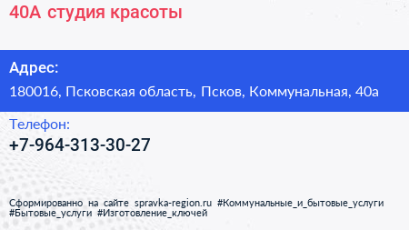 40А, студия красоты по адресу 180016, Псковская область, Псков, Коммунальная, 40а в дальнейшем Организация, размещена в следующих категориях: