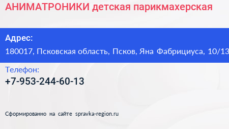 АНИМАТРОНИКИ, детская парикмахерская по адресу 180017, Псковская область, Псков, Яна Фабрициуса, 10/13 в дальнейшем Организация, размещена в следующих категориях: