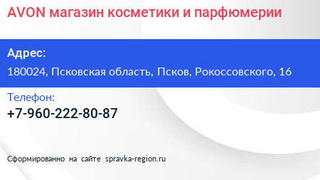 AVON, магазин косметики и парфюмерии по адресу 180024, Псковская область, Псков, Рокоссовского, 16 в дальнейшем Организация, размещена в следующих категориях: