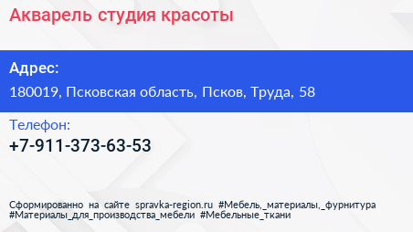 Акварель, студия красоты по адресу 180019, Псковская область, Псков, Труда, 58 в дальнейшем Организация, размещена в следующих категориях: