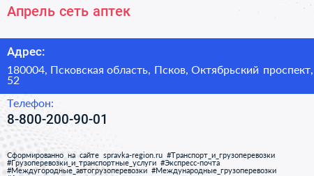 Апрель, сеть аптек по адресу 180004, Псковская область, Псков, Октябрьский проспект, 52 в дальнейшем Организация, размещена в следующих категориях: