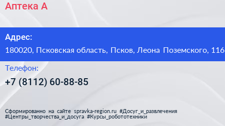 Аптека-А по адресу 180020, Псковская область, Псков, Леона Поземского, 116 в дальнейшем Организация, размещена в следующих категориях: