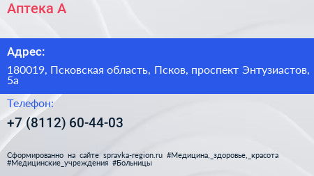Аптека-А по адресу 180019, Псковская область, Псков, проспект Энтузиастов, 5а в дальнейшем Организация, размещена в следующих категориях: