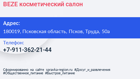 BEZE, косметический салон по адресу 180019, Псковская область, Псков, Труда, 50а в дальнейшем Организация, размещена в следующих категориях: