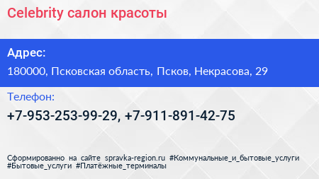 Celebrity, салон красоты по адресу 180000, Псковская область, Псков, Некрасова, 29 в дальнейшем Организация, размещена в следующих категориях: