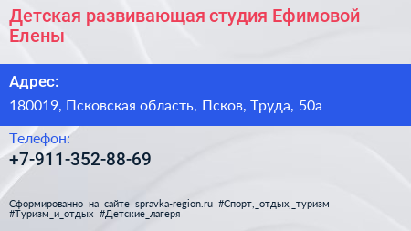Детская развивающая студия Ефимовой Елены по адресу 180019, Псковская область, Псков, Труда, 50а в дальнейшем Организация, размещена в следующих категориях: