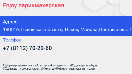 Enjoy, парикмахерская по адресу 180016, Псковская область, Псков, Майора Доставалова, 1 в дальнейшем Организация, размещена в следующих категориях:
