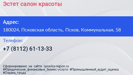 Эстет, салон красоты по адресу 180024, Псковская область, Псков, Коммунальная, 58 в дальнейшем Организация, размещена в следующих категориях: