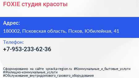 FOXIE, студия красоты по адресу 180002, Псковская область, Псков, Юбилейная, 41 в дальнейшем Организация, размещена в следующих категориях: